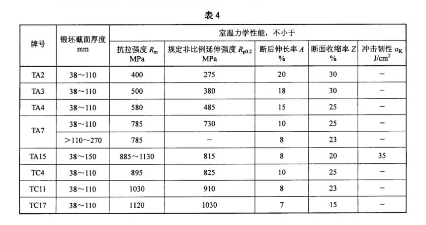 3.4.2 棒材的室溫力學性能應符合表3的規定,鍛坯的室溫力學性能應符合表4的規定,超出表中規格范圍的棒材或鍛坯的室溫力學性能由雙方協商確定。