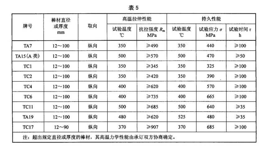 3.4.3 訂購方要求并在合同中注明時,鈦合金棒材的高溫拉伸、持久性能應符合表5的規定,TA19和TC17鈦合金棒材的熱穩定性和高溫蠕變性能應符合表6的規定。
